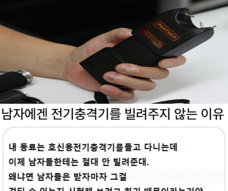 유머남자에게 전기충격기를 안 빌려주는 이유위키뉴스 기자입력북마크공유가글자크기프린트댓글남자에게 전기충격기를 안 빌려주는 이유 위키뉴스 기자[email protected]카카오톡페이스북트위터밴드URL복사
