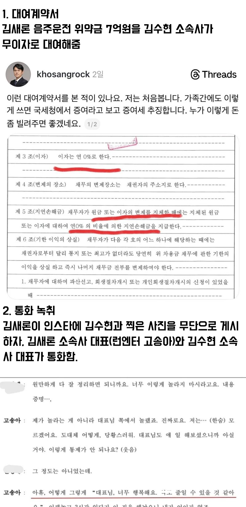 김수현 측이 수사기관에 제출한 고 김새론의 내용증명과 대여계약서, 소속사 대표간의 통화 녹취가 공개됐다