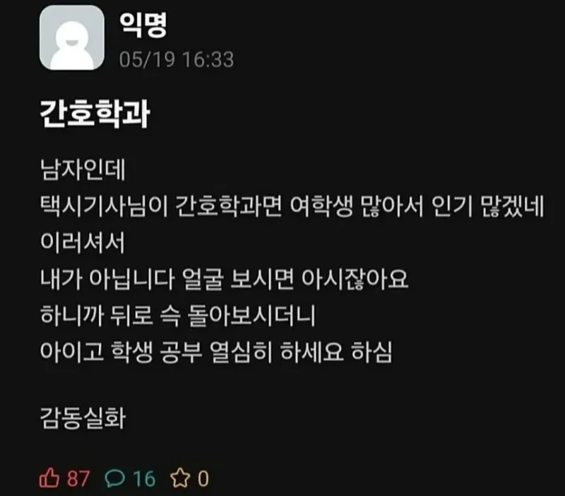 유머남자인데 간호학과면 인기 많겠네?위키뉴스 기자입력북마크공유가글자크기프린트댓글남자인데 간호학과면 인기 많겠네?위키뉴스 기자[email protected]카카오톡페이스북트위터밴드URL복사