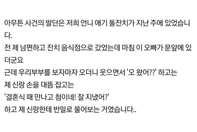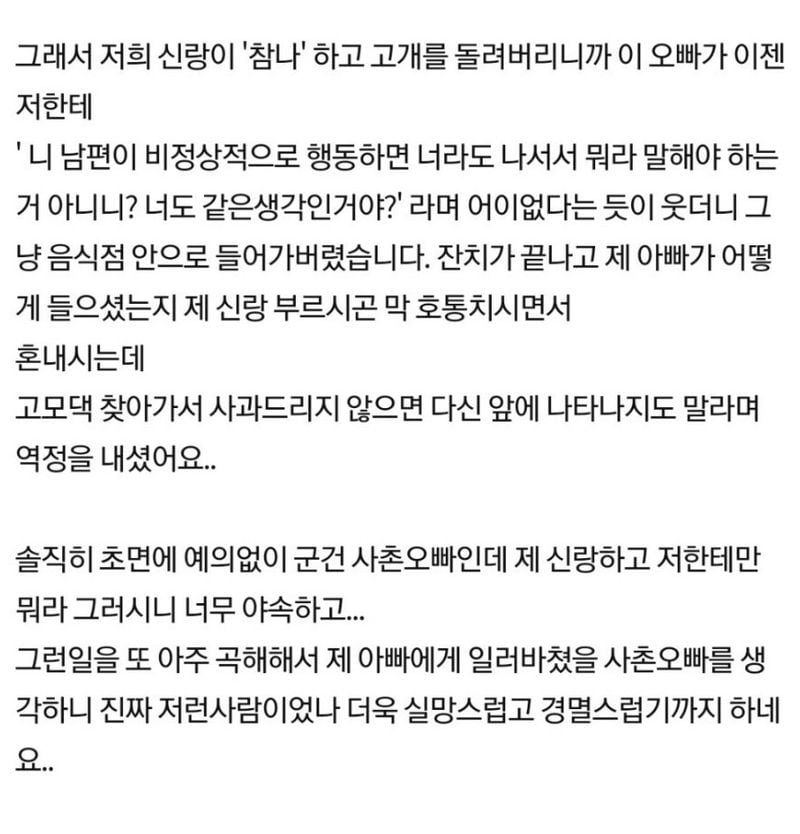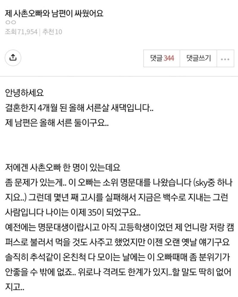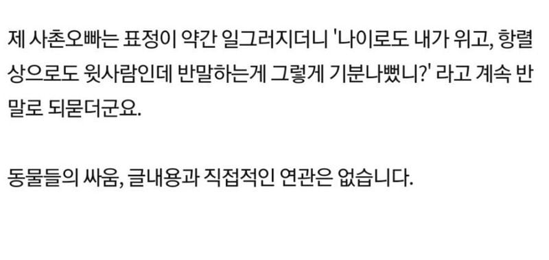 유머사촌오빠랑 제 남편이 ㅆ웠는데요위키뉴스 기자입력북마크공유가글자크기프린트댓글빡침) 사촌오빠랑 제 남편이 싸웠는데요… 위키뉴스 기자[email protected]카카오톡페이스북트위터밴드URL복사