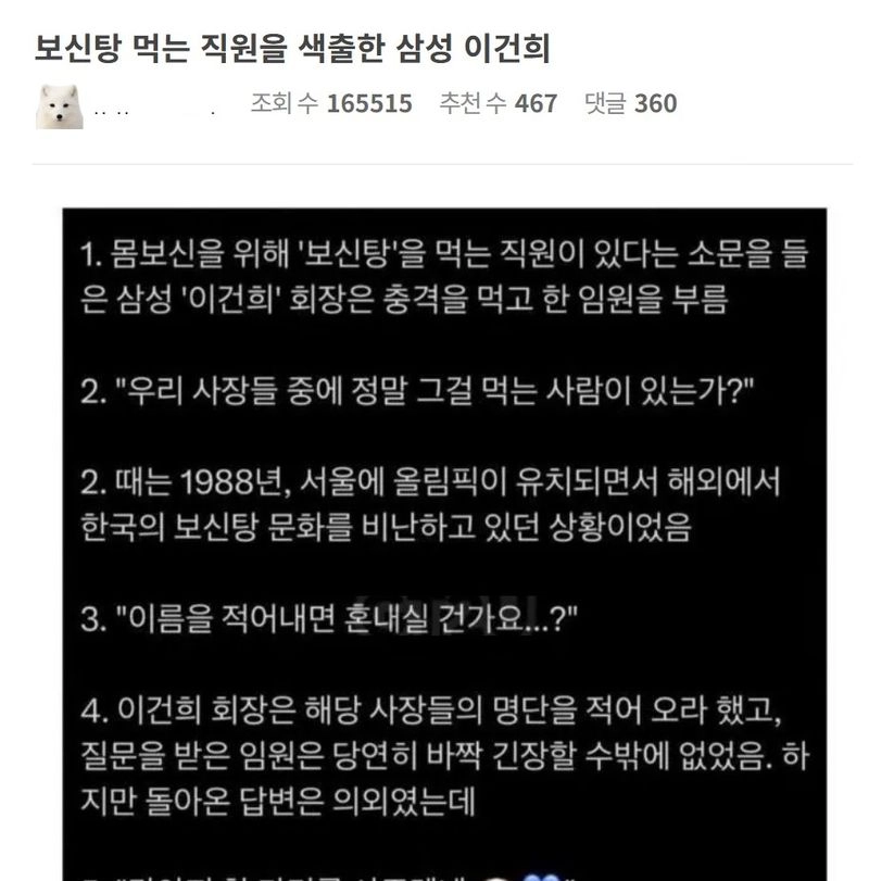 리와인드뉴스보신탕 먹는 직원을 색출한 삼성 이건희위키뉴스 기자입력북마크공유가글자크기프린트댓글 보신탕 먹는 직원을 색출한 삼성 이건희 위키뉴스 기자[email protected]카카오톡페이스북트위터밴드URL복사