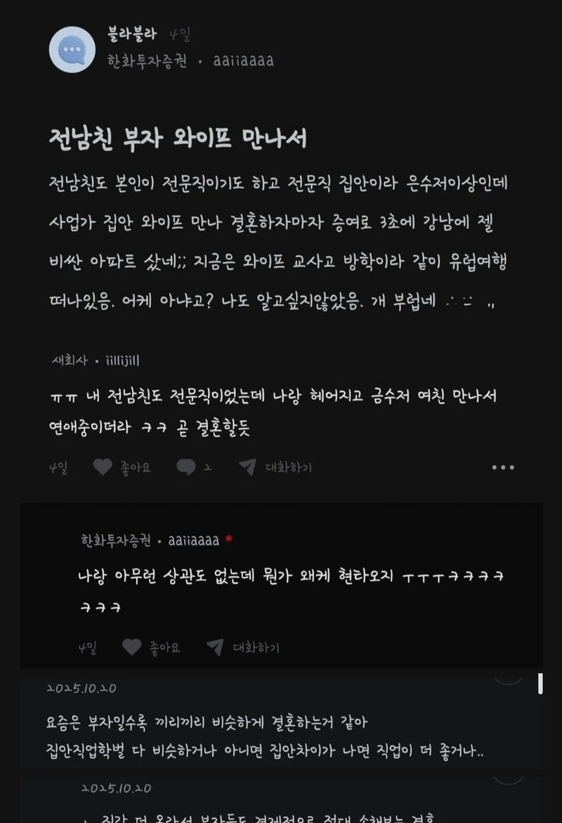 유머씁쓸씁쓸 결혼 현실위키뉴스 기자입력북마크공유가글자크기프린트댓글 씁쓸씁쓸 결혼 현실 꼭 금수저가 아니더라도서울에 작은 집 두채씩 있는 부모의 자식들이 만나면상속으로 50억대 부자부부 탄생 위키뉴스 기자[email protected]카카오톡페이스북트위터밴드URL복사