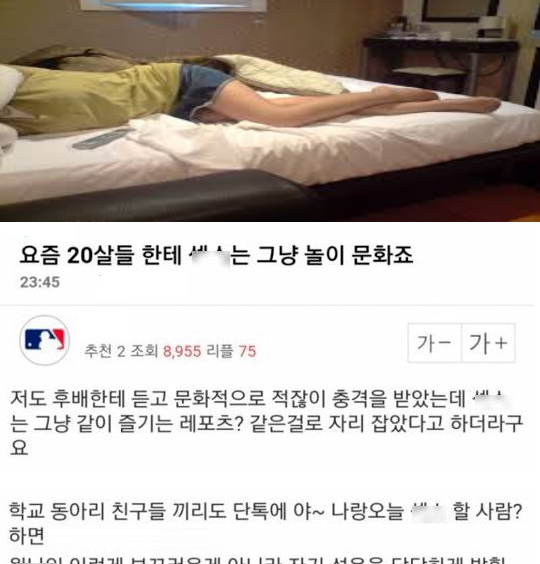 유머요즘 20살들한테 ㅅㅅ는 그냥 놀이 문화죠.위키뉴스 기자입력북마크공유가글자크기프린트댓글 요즘 20살들한테 ㅅㅅ는 그냥 놀이 문화죠. 위키뉴스 기자[email protected]카카오톡페이스북트위터밴드URL복사