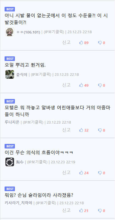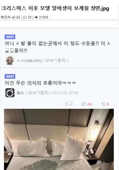유머크리스마스 이후 모텔 알바생이 보게될 장면.jpg위키뉴스 기자입력북마크공유가글자크기프린트댓글크리스마스 이후 모텔 알바생이 보게될 장면.jpg위키뉴스 기자[email protected]카카오톡페이스북트위터밴드URL복사