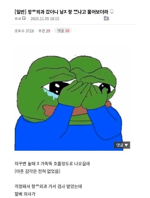 리와인드뉴스항ㅁ외과 갔더니 남자랑 했냐고 물어보더라.jpg위키뉴스 기자입력북마크공유가글자크기프린트댓글 항ㅁ외과 갔더니 남자랑 했냐고 물어보더라.jpg 위키뉴스 기자[email protected]카카오톡페이스북트위터밴드URL복사
