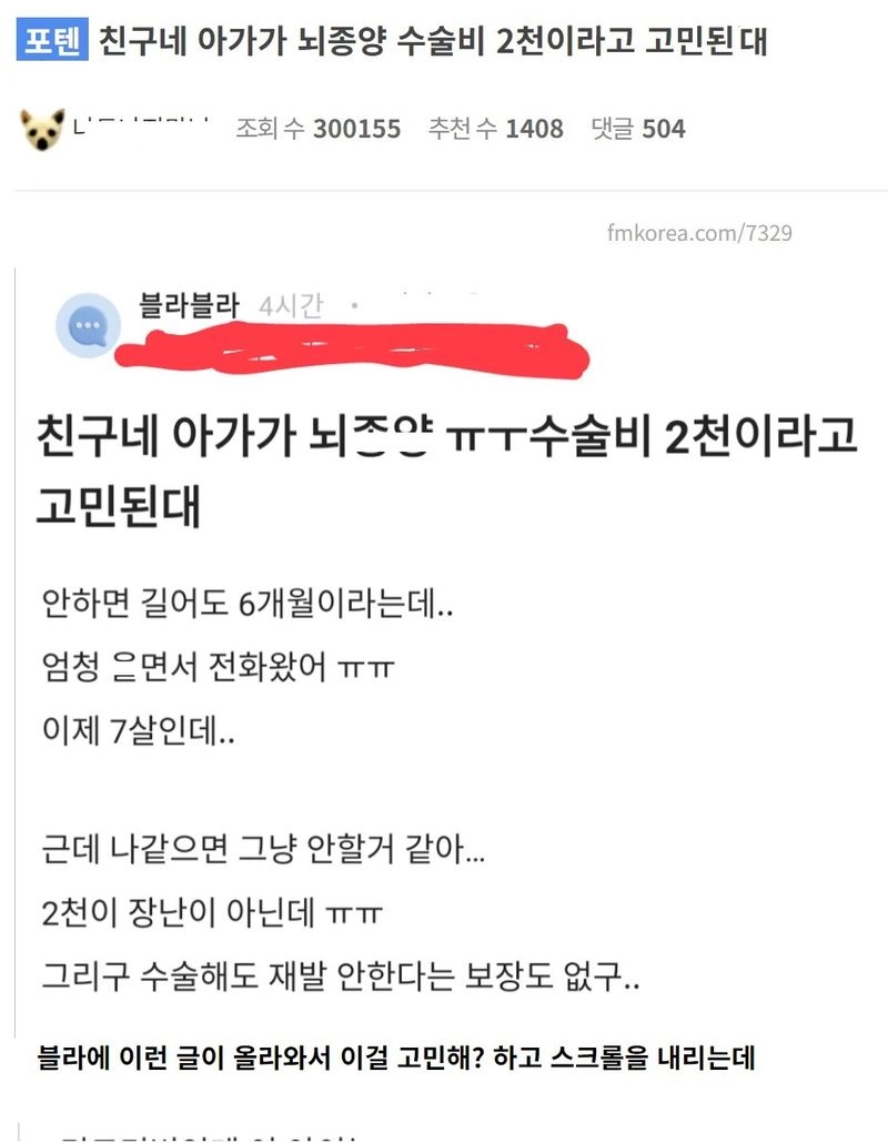 리와인드뉴스친구네 아가가 뇌종양 수술비 2천이라고 고민된대..jpg위키뉴스 기자입력북마크공유가글자크기프린트댓글 친구네 아가가 뇌종양 수술비 2천이라고 고민된대..jpg 위키뉴스 기자[email protected]카카오톡페이스북트위터밴드URL복사