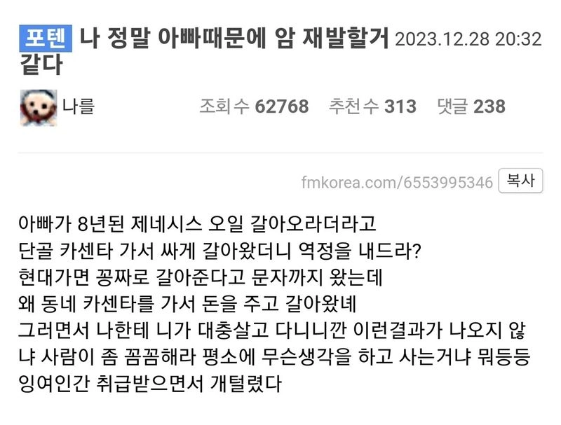 리와인드뉴스나 정말 아빠 때문에 암 재발할 거 같다위키뉴스 기자입력북마크공유가글자크기프린트댓글 나 정말 아빠 때문에 암 재발할 거 같다 위키뉴스 기자[email protected]카카오톡페이스북트위터밴드URL복사