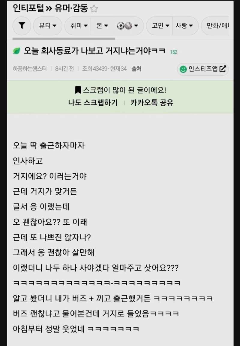 유머오늘 회사동료한테 거지 소리들음ㅋㅋㅋ위키뉴스 기자입력북마크공유가글자크기프린트댓글오늘 회사동료한테 거지 소리들음ㅋㅋㅋ 위키뉴스 기자[email protected]카카오톡페이스북트위터밴드URL복사