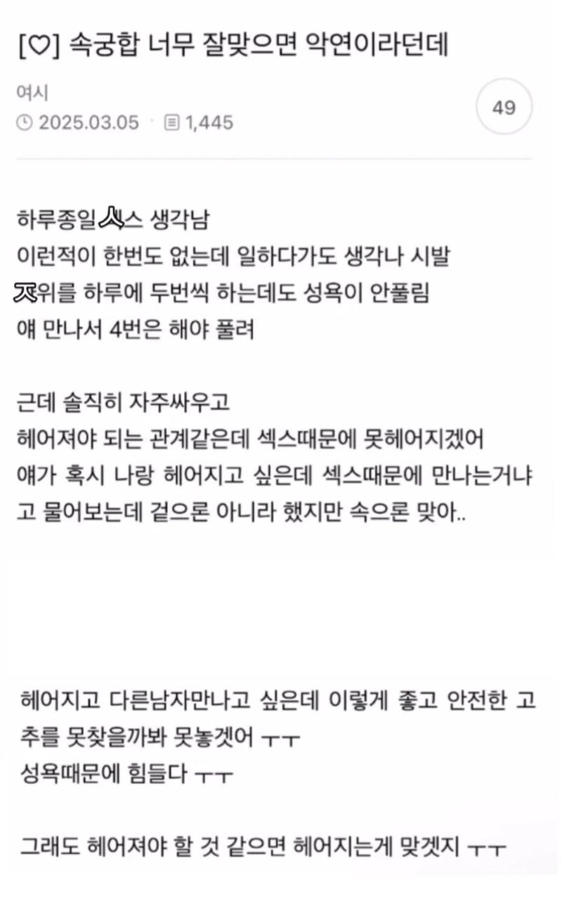 유머속궁합 너무 잘맞으면 악연이라는데...위키뉴스 기자입력북마크공유가글자크기프린트댓글속궁합 너무 잘맞으면 악연이라는데... 위키뉴스 기자[email protected]카카오톡페이스북트위터밴드URL복사