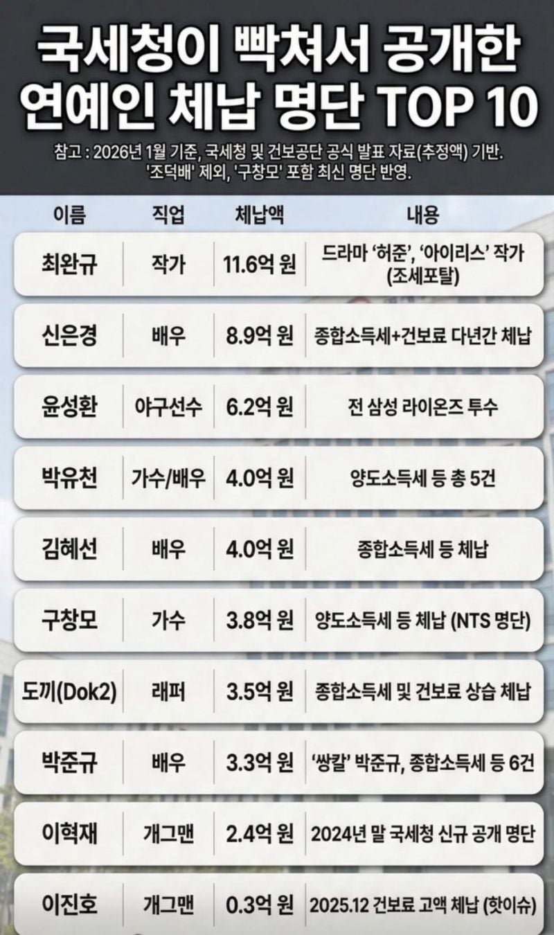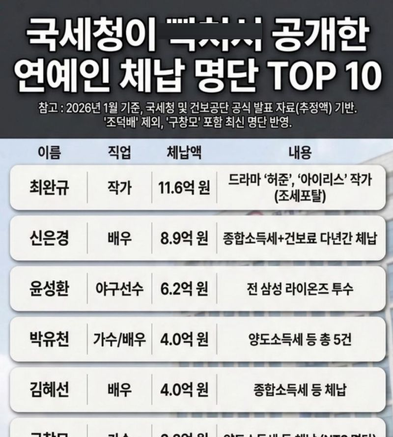 유머국세청이 빡ㅊ서 공개한 26년 1월 기준 연예인 체납 명단위키뉴스 기자입력북마크공유가글자크기프린트댓글국세청이 빡ㅊ서 공개한 26년 1월 기준 연예인 체납 명단위키뉴스 기자[email protected]카카오톡페이스북트위터밴드URL복사