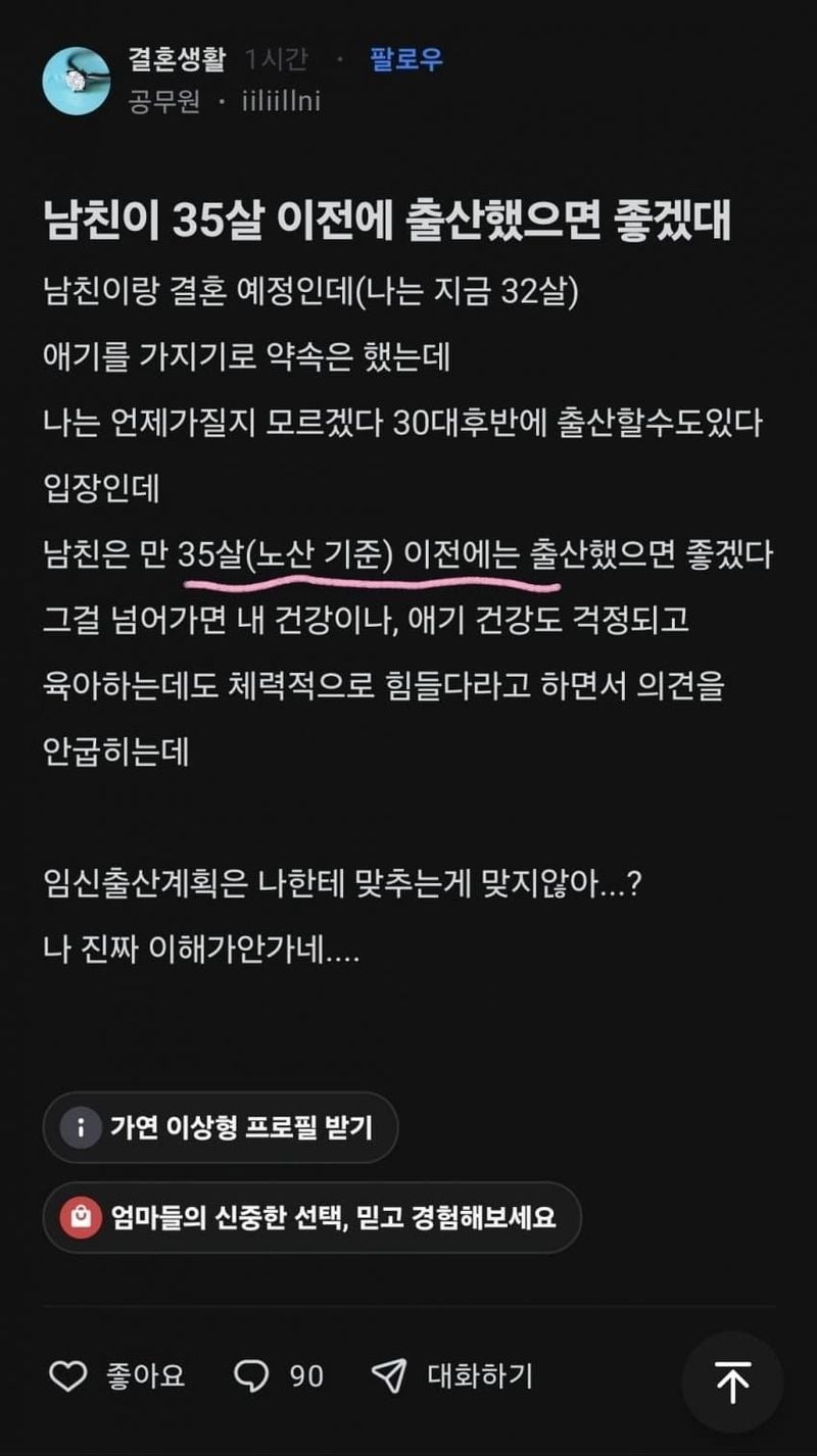 유머남친이 35살 이전에 출산했으면 좋겠데위키뉴스 기자입력북마크공유가글자크기프린트댓글남친이 35살 이전에 출산했으면 좋겠데 위키뉴스 기자[email protected]카카오톡페이스북트위터밴드URL복사