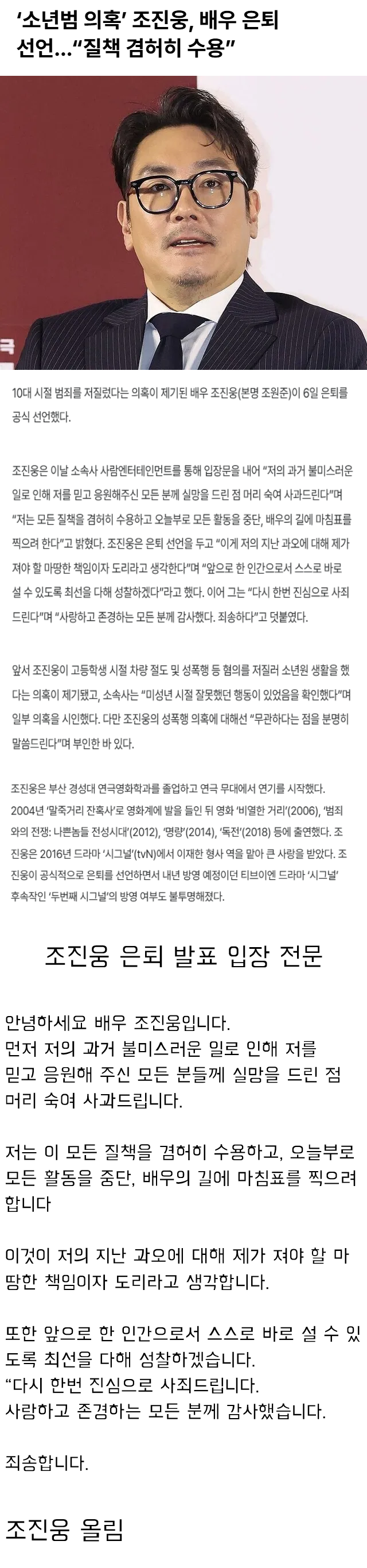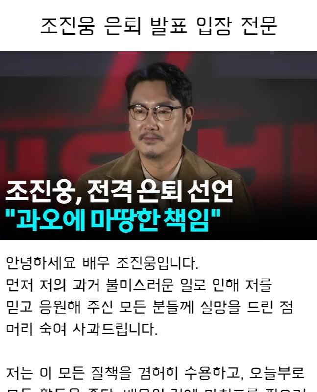 실시간 은퇴 발표한 조진웅의 은퇴 발표 입장 전문
