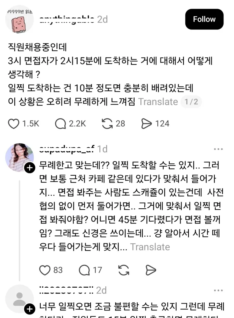 유머면접시간보다 45분 일찍 온 지원자 무례 논란위키뉴스 기자입력북마크공유가글자크기프린트댓글면접시간보다 45분 일찍 온 지원자 무례 논란 위키뉴스 기자[email protected]카카오톡페이스북트위터밴드URL복사