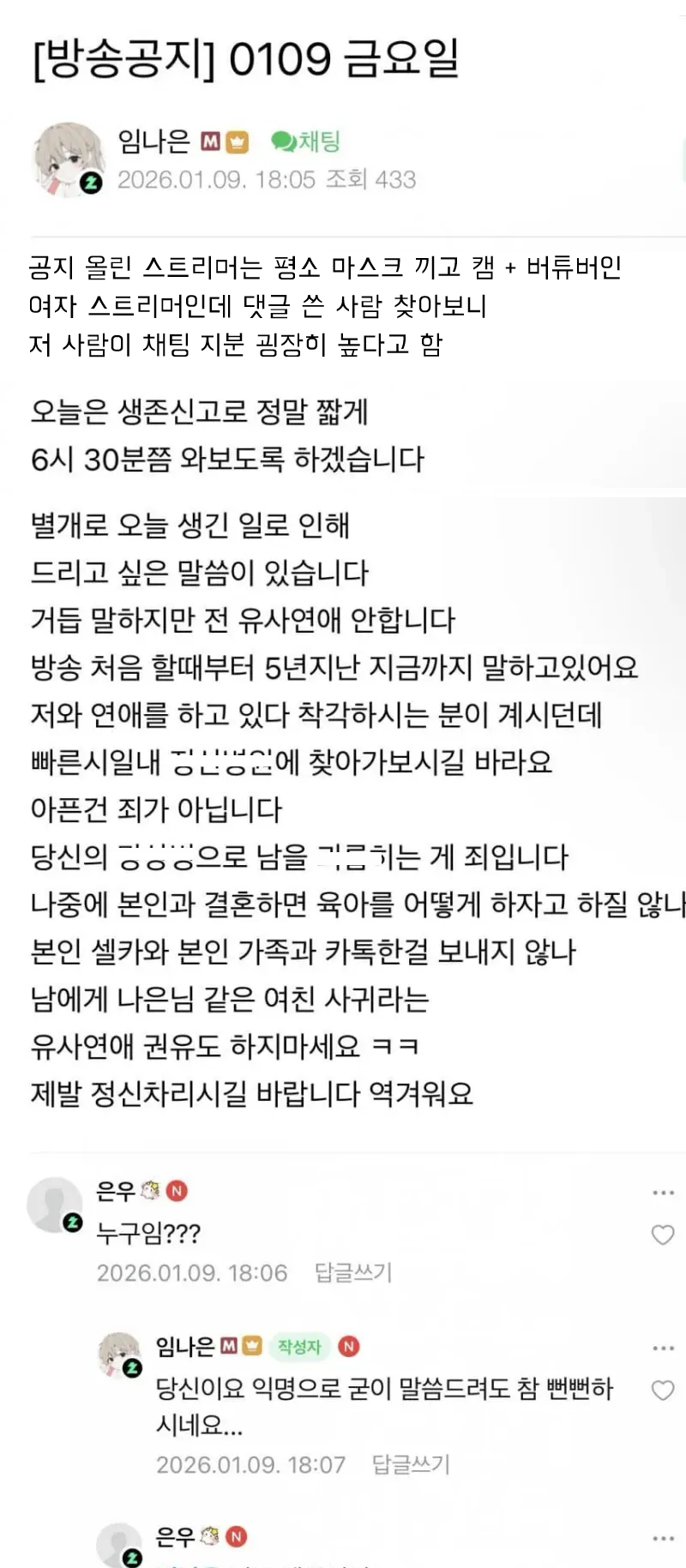 유머인방) 스ㅌ커가 누구냐고? 너요위키뉴스 기자입력북마크공유가글자크기프린트댓글인방) 스ㅌ커가 누구냐고? 너요공지 올린 스트리머는 평소 마스크 끼고 캠 + 버튜버인 여자 스트리머인데댓글 쓴 사람 찾아보니 저 사람이 채팅 지분 굉장히 높다고 함개무섭네 위키뉴스 기자[email protected]카카오톡페이스북트위터밴드URL복사