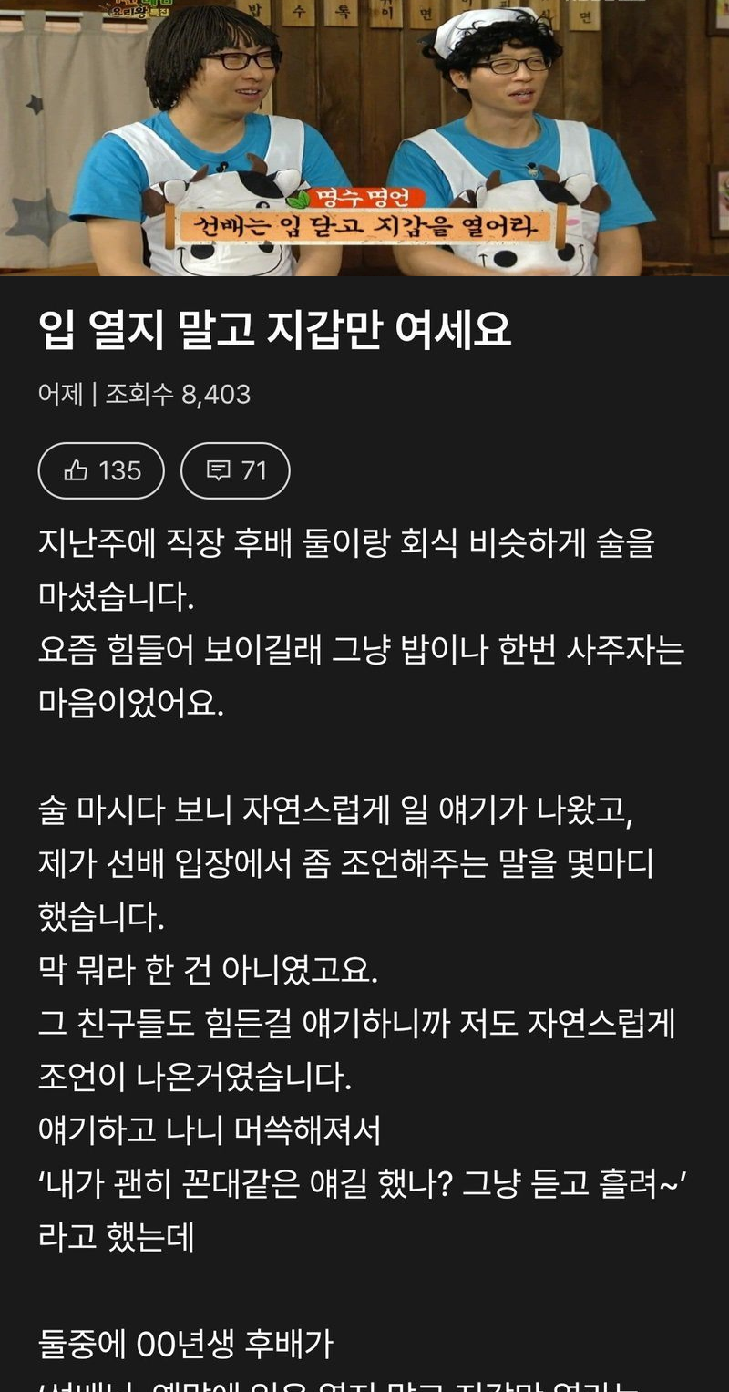 유머"선배는 입 닫고 지갑을 열어라"라는 밈을 실제로 뱉어버린 직장 후배"위키뉴스 기자입력북마크공유가글자크기프린트댓글"선배는 입 닫고 지갑을 열어라"라는 밈을 실제로 뱉어버린 직장 후배"이걸 실제로 시전하네 ㄷㄷ위키뉴스 기자[email protected]카카오톡페이스북트위터밴드URL복사