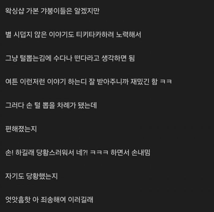 유머왁싱 관리사에게 조련 당한 남자...위키뉴스 기자입력북마크공유가글자크기프린트댓글왁싱 관리사에게 조련 당한 남자 위키뉴스 기자[email protected]카카오톡페이스북트위터밴드URL복사