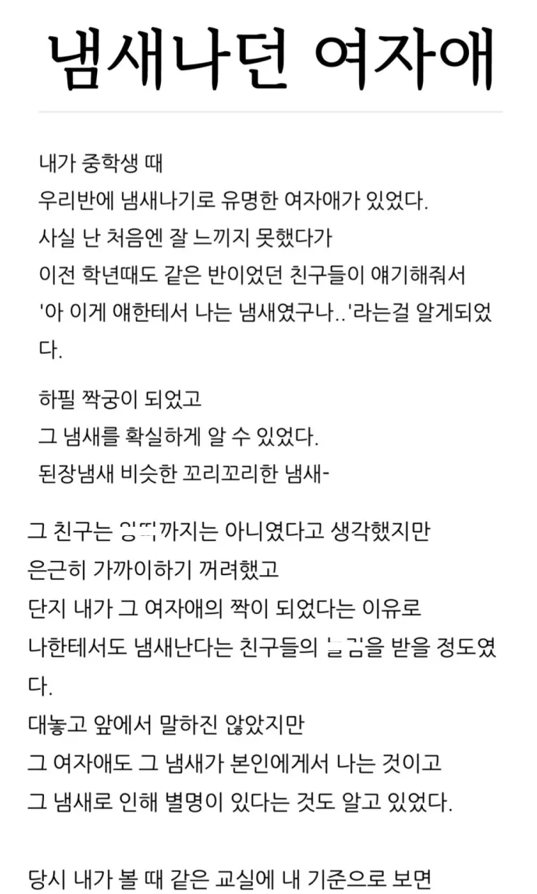 유머중학교 때 냄새나던 여자애 썰위키뉴스 기자입력북마크공유가글자크기프린트댓글 중학교 때 냄새나던 여자애 썰위키뉴스 기자[email protected]카카오톡페이스북트위터밴드URL복사
