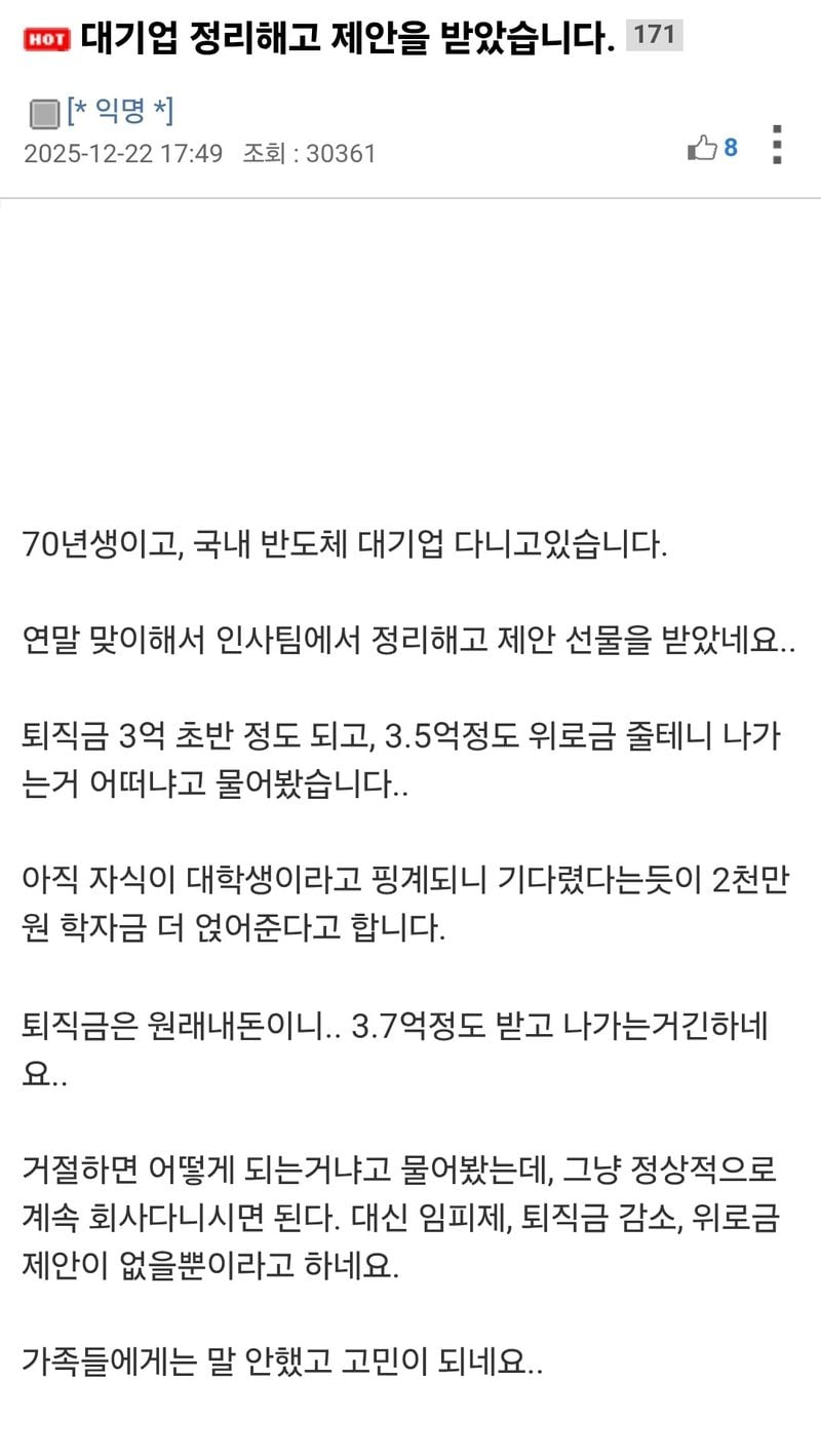 유머대기업 정리해고 제안을 받았습니다....위키뉴스 기자입력북마크공유가글자크기프린트댓글대기업 정리해고 제안을 받았습니다.... 위키뉴스 기자[email protected]카카오톡페이스북트위터밴드URL복사