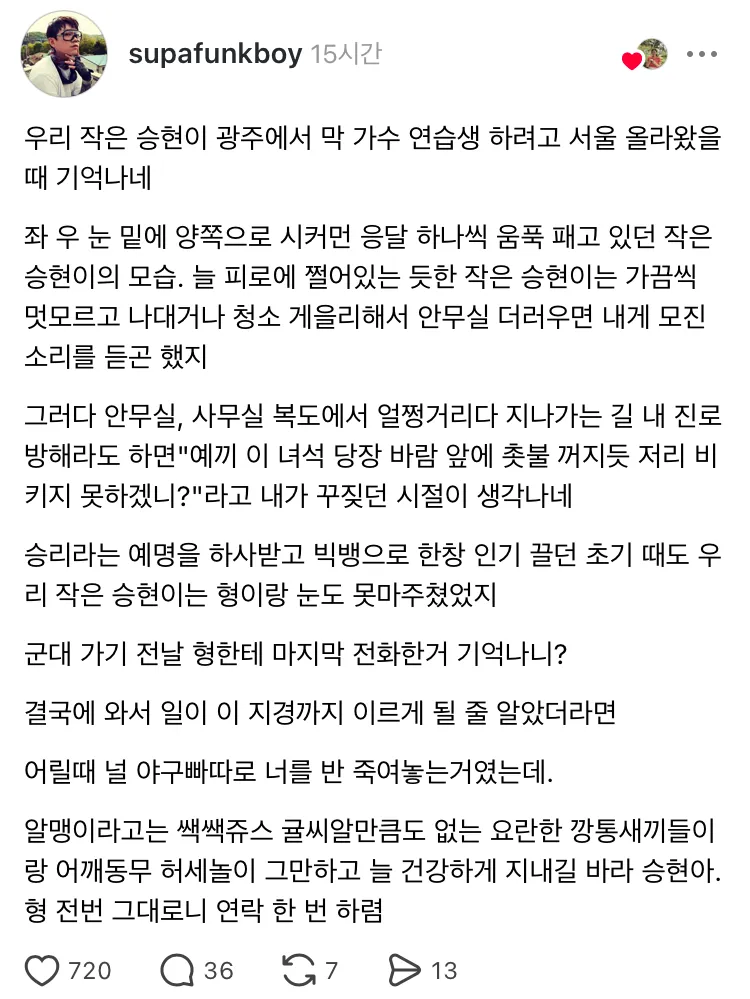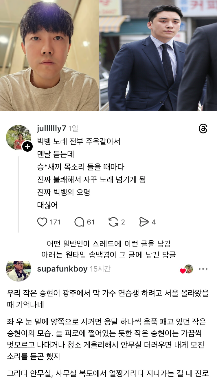 유머前 빅뱅 승리와의 썰 푸는 원타임 송백경위키뉴스 기자입력북마크공유가글자크기프린트댓글 前 빅뱅 승리와의 썰 푸는 원타임 송백경어떤 일반인이 스레드에 이런 글을 남김아래는 원타임 송백경이 그 글에 남긴 답글 위키뉴스 기자[email protected]카카오톡페이스북트위터밴드URL복사