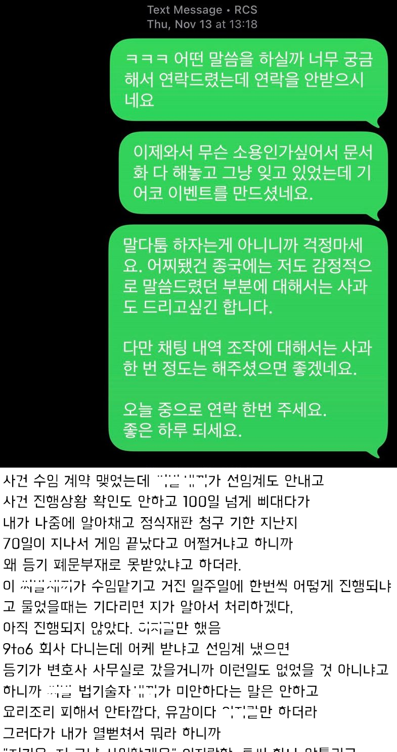 한 3달 지나니까 본인한테 유리한 멘트로 조작된 카톡 대화내역 캡쳐 보내더라ㅋ "어떻게 해야할지만 알려주시면 감사하겠습니다" 이런식으로 내가 말하지도 않은 내용의 카톡 기록 만들어서 수임,재판이 아니라 단순 법률상담으로 몰아가려고.