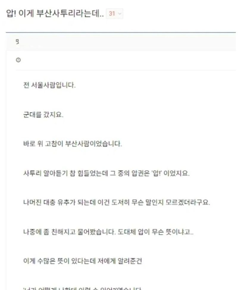 리와인드뉴스처음들으면 충격받는다는 부산사투리.jpg위키뉴스 기자입력북마크공유가글자크기프린트댓글 처음들으면 충격받는다는 부산사투리.jpg 압 이거 ㄹㅇ임? 현지특파원들 말좀... 위키뉴스 기자[email protected]카카오톡페이스북트위터밴드URL복사