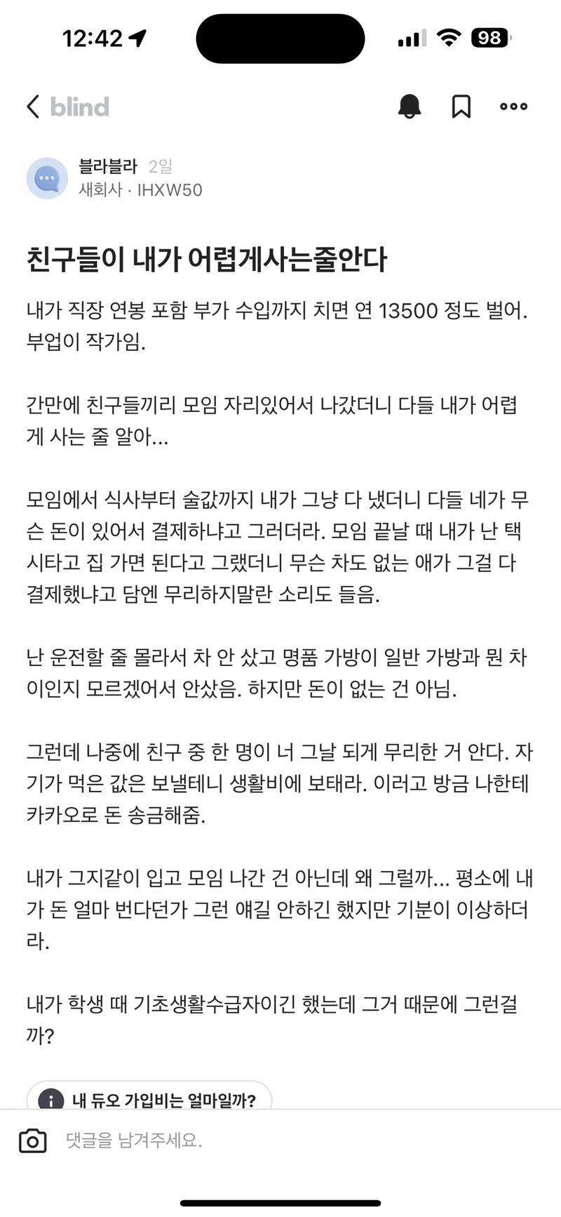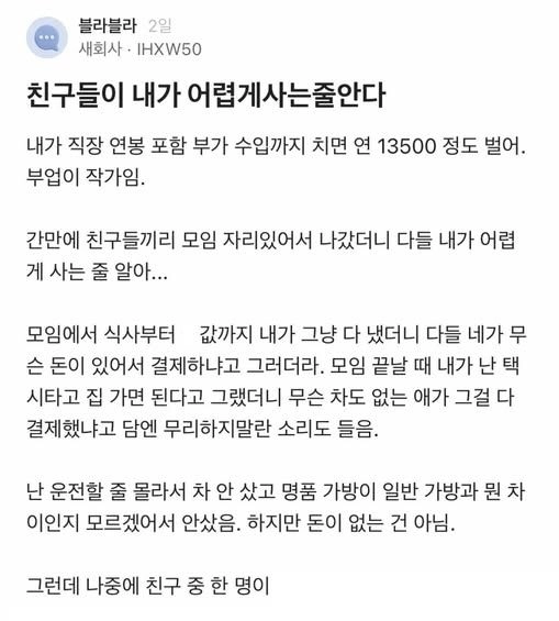대충 나 1억넘게 버는데 친구들이 나 못사는줄알아서 자존심상한다 뭐 이런글
