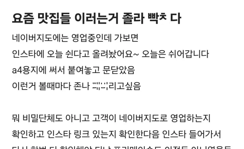 유머맛집들 장난질에 개ㅃ친 직장인위키뉴스 기자입력북마크공유가글자크기프린트댓글 맛집들 장난질에 개ㅃ친 직장인 근데 네이버지도로 영업중인거 보고갔는데 문 닫혀있으면 좀 짜증나긴함.. 개드립으로 165 붐업 0위키뉴스 기자[email protected]카카오톡페이스북트위터밴드URL복사