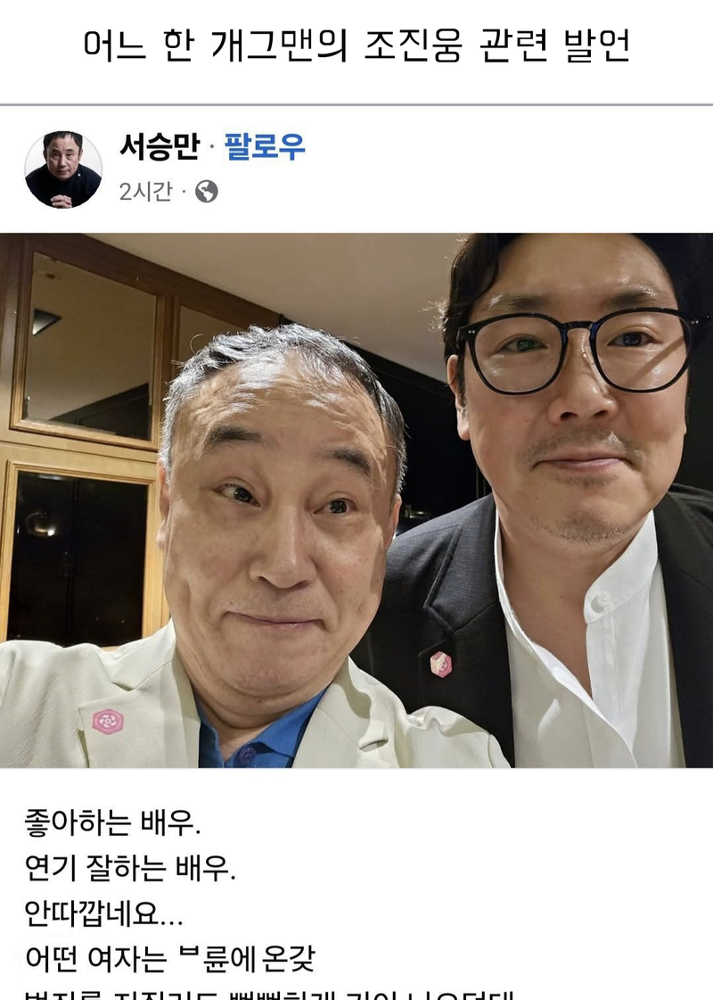 유머어느 한 개그맨의 조진웅 관련 발언위키뉴스 기자입력북마크공유가글자크기프린트댓글개그맨 서승만의 조진웅 관련 발언 위키뉴스 기자[email protected]카카오톡페이스북트위터밴드URL복사