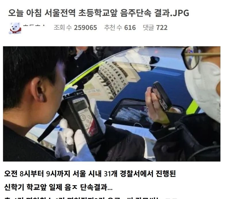 오늘 아침 서울전역 초등학교앞 음ㅈ단속 결과 ㄷㄷㄷ