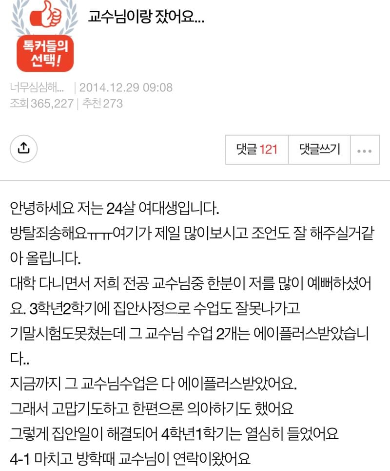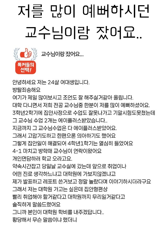 유머저를 많이 예뻐하시던 교수님이랑 잤어요..위키뉴스 기자입력북마크공유가글자크기프린트댓글교수님이랑 잤어요… 위키뉴스 기자[email protected]카카오톡페이스북트위터밴드URL복사