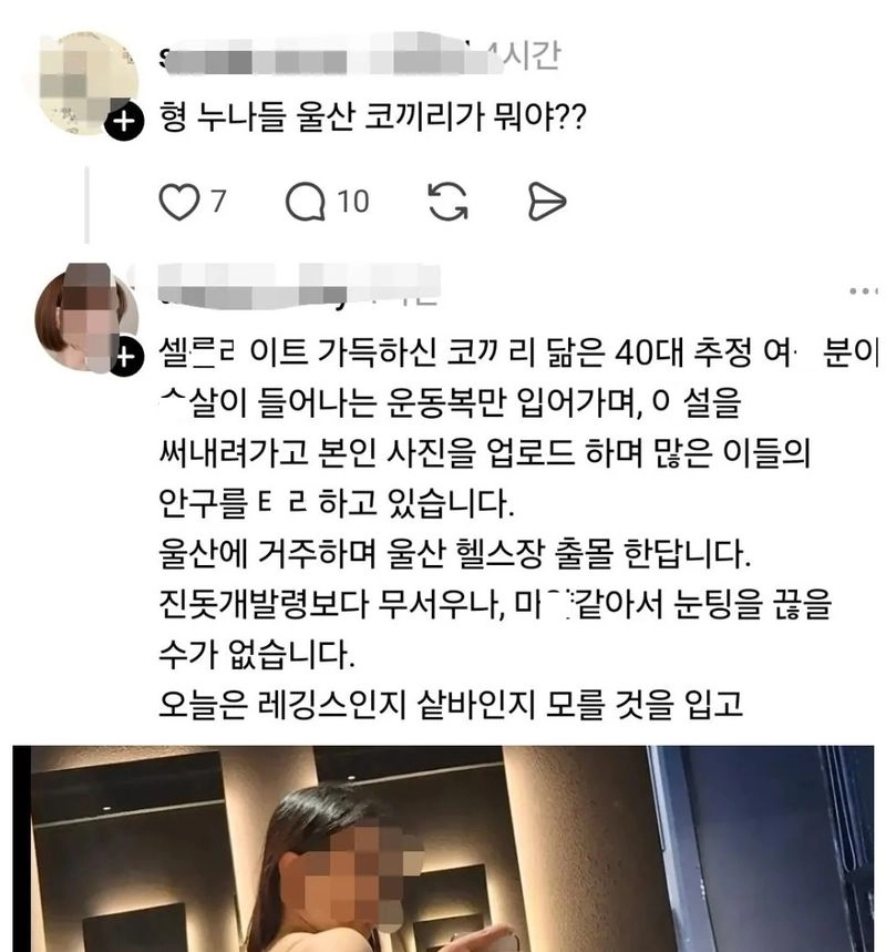 울산에 노출심한 옷 입고 운동하는 사람이 있는데 스레드에 오운완 사진 올리면서 테러(?)중