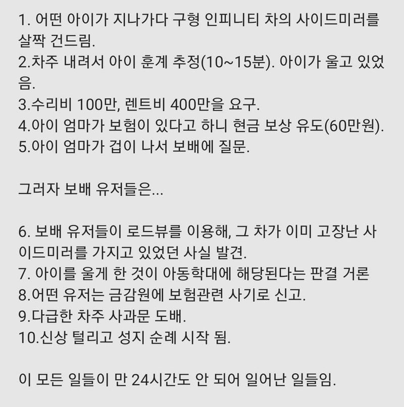 인피차주 아이 엄마한테 문자해서 글 내려달라고 전화 문자 엄청 날림