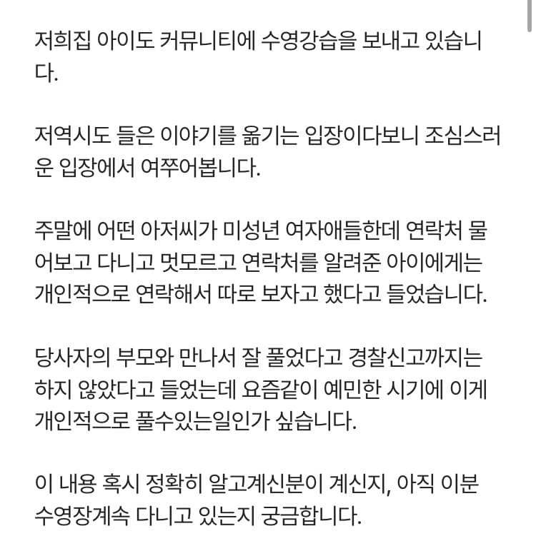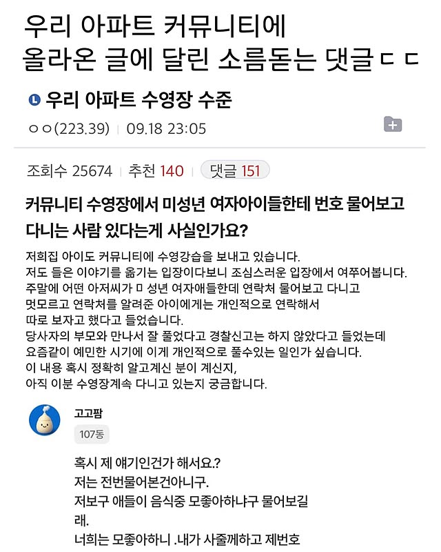 유머오늘 아파트 커뮤니티에 올라온 글에 달린 소름돋는 댓글 ㄷㄷ위키뉴스 기자입력북마크공유가글자크기프린트댓글소름..) 우리 아파트 수영장 수준 위키뉴스 기자[email protected]카카오톡페이스북트위터밴드URL복사