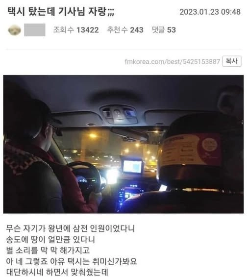 리와인드뉴스택시 탔는데 기사님이 자기 자랑 엄청 하네위키뉴스 기자입력북마크공유가글자크기프린트댓글 택시 탔는데 기사님이 자기 자랑 엄청 하네 위키뉴스 기자[email protected]카카오톡페이스북트위터밴드URL복사