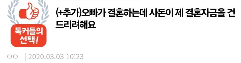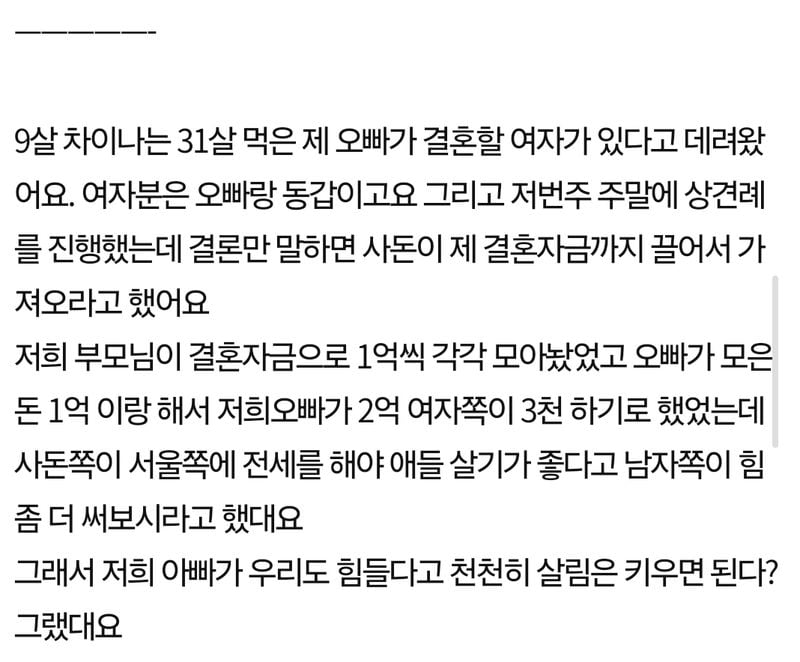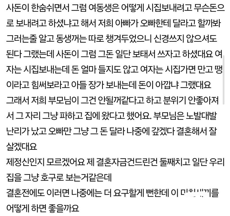 유머오빠 결혼하는데 사돈이 제 결혼자금 건드리려고 해요..(+3년 후 후기)위키뉴스 기자입력북마크공유가글자크기프린트댓글오빠가 결혼하는데 사돈이 제 결혼자금을 건드리려해요(+3년후 후기ㄷㄷ) 위키뉴스 기자[email protected]카카오톡페이스북트위터밴드URL복사