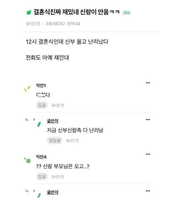 리와인드뉴스결혼식진짜 재밌네 신랑이 안옴ㅋㅋ위키뉴스 기자입력북마크공유가글자크기프린트댓글결혼식진짜 재밌네 신랑이 안옴ㅋ 돔황챠 위키뉴스 기자[email protected]카카오톡페이스북트위터밴드URL복사