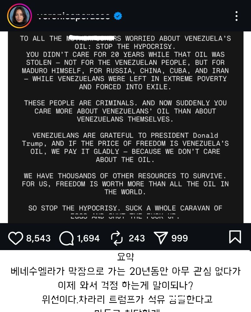 베네수엘라 사람들은 도널드 트럼프 대통령에게 감사하고 있다. 만약 자유의 대가가 베네수엘라의 석유라면, 우리는 기꺼이 그 값을 치를 것이다. 왜냐하면 우리는 석유 따위는 신경 쓰지 않기 때문이다.