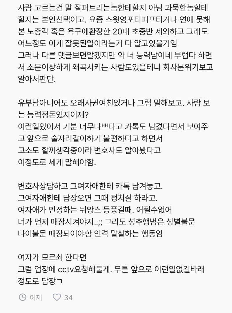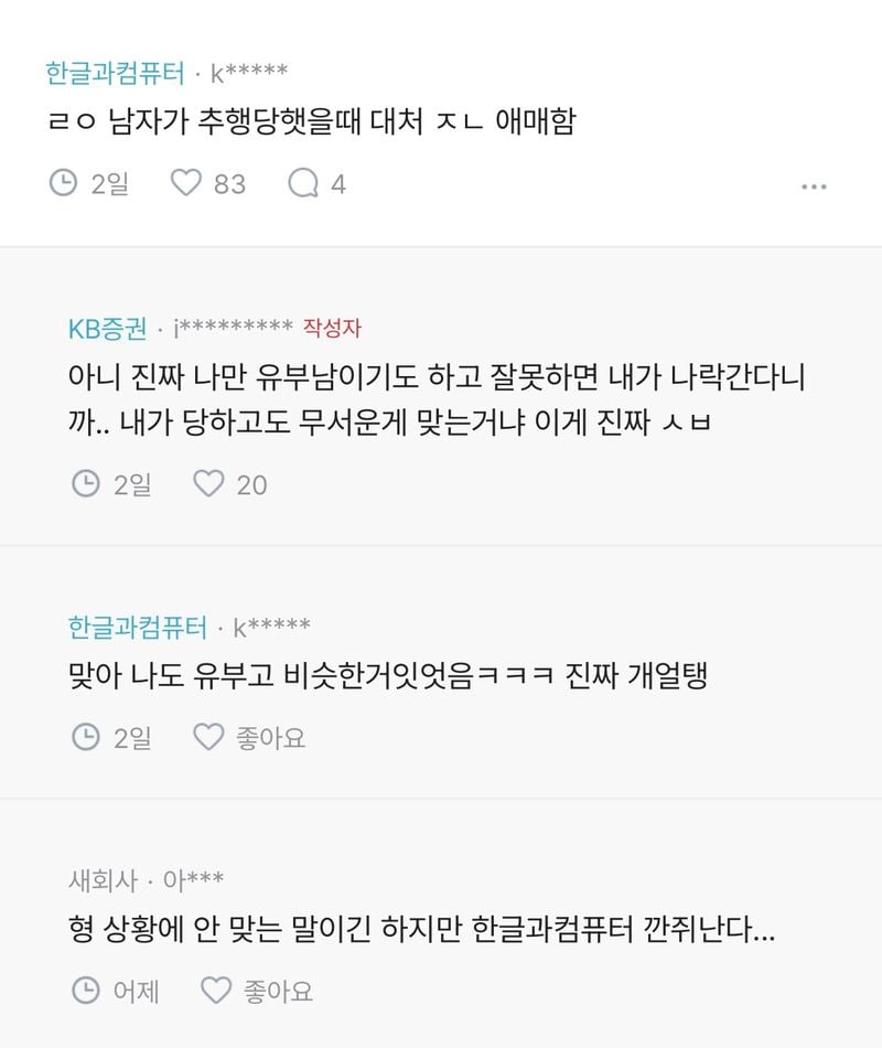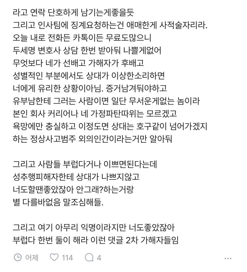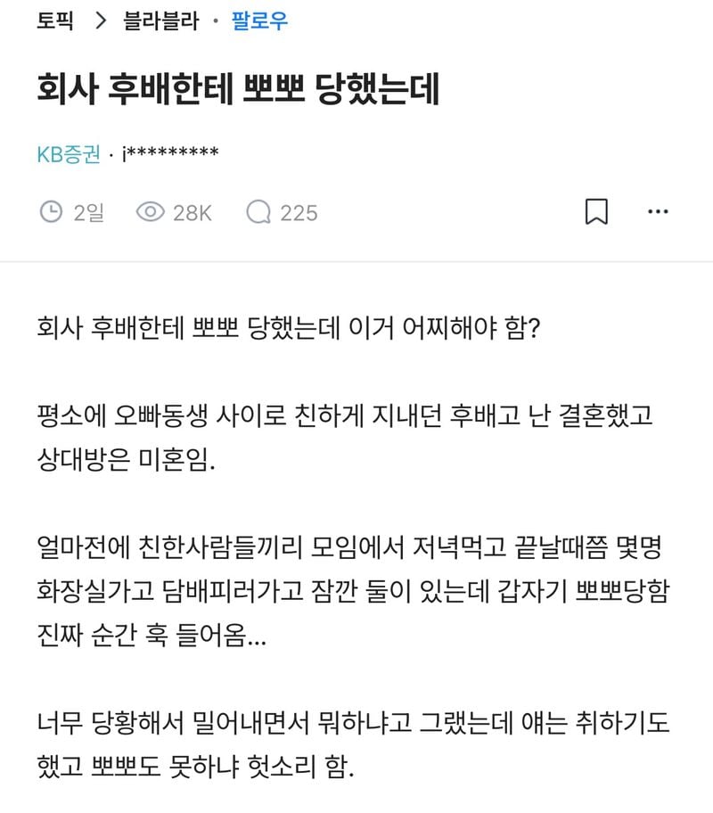유머블라)회사 후배한테 뽀뽀 당했는데(+후기)위키뉴스 기자입력북마크공유가글자크기프린트댓글블라) 회사 후배한테 뽀뽀 당했는데… 위키뉴스 기자[email protected]카카오톡페이스북트위터밴드URL복사