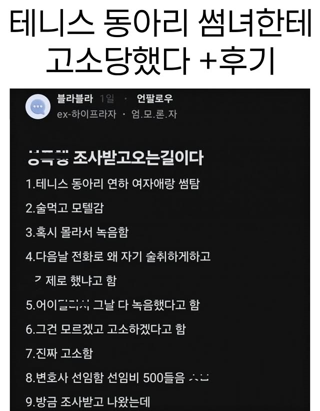 유머테니스 동아리 썸녀한테 고소당했다 (+후기)위키뉴스 기자입력북마크공유가글자크기프린트댓글테니스 동아리 썸녀한테 고소당했다 +후기 위키뉴스 기자[email protected]카카오톡페이스북트위터밴드URL복사