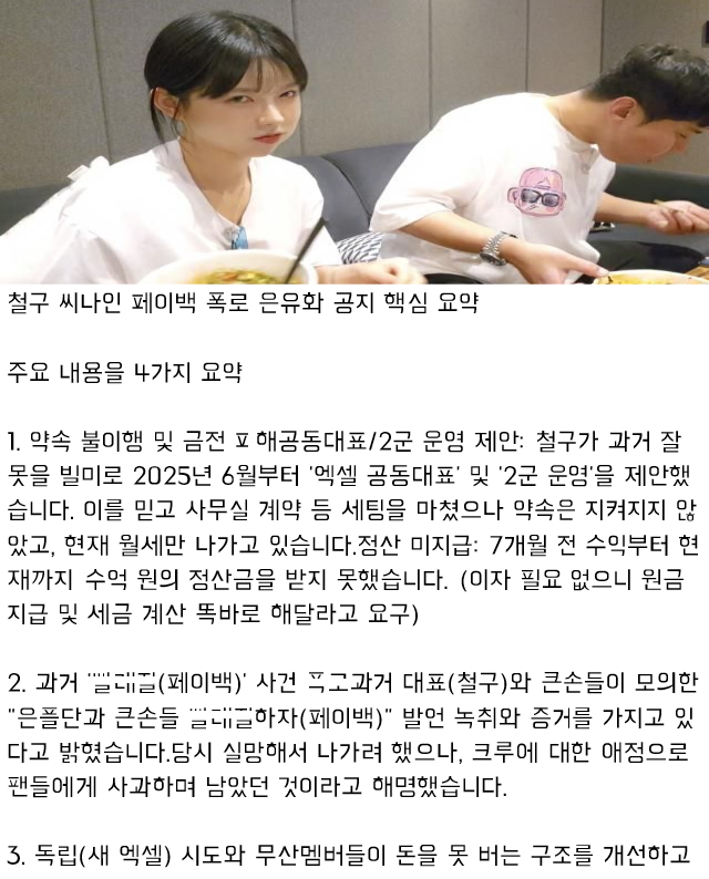 - 과거 대표(철구)와 큰손들이 모의한 "은플단과 큰손들 빨래질하자(페이백)" 발언 녹취와 증거를 가지고 있다고 밝혔습니다.