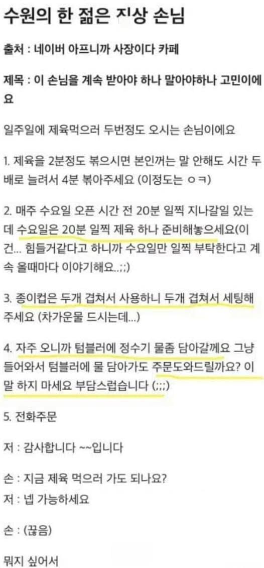 유머수원 자영업자들 사이에서 유명해진 제육 빌런위키뉴스 기자입력북마크공유가글자크기프린트댓글수원 자영업자들 사이에서 유명해진 제육 빌런ㄷㄷ 위키뉴스 기자[email protected]카카오톡페이스북트위터밴드URL복사