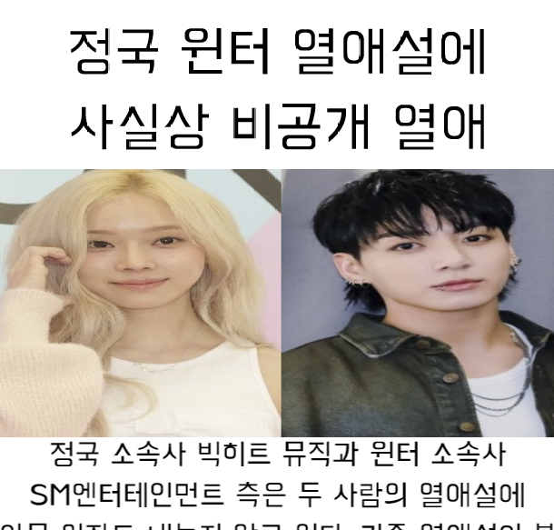 그룹 방탄소년단 정국과 에스파 윈터의 열애설에 양측 모두 “입장 없다”고 선을 그었다. 비공개하고 싶지만 사실상 열애의 시작이다.