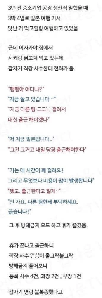리와인드뉴스해외여행 중인데 당장 출근하라는 회사위키뉴스 기자입력북마크공유가글자크기프린트댓글 해외여행 중인데 당장 출근하라는 회사 위키뉴스 기자[email protected]카카오톡페이스북트위터밴드URL복사