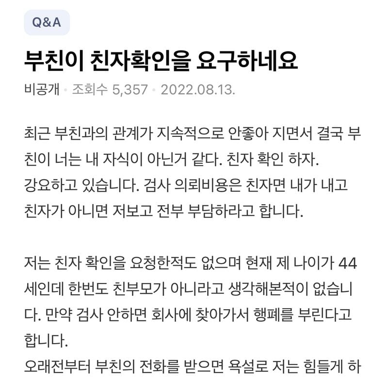 유머아버지가 44년이 지났는데 친자 확인을 요구하는 이유위키뉴스 기자입력북마크공유가글자크기프린트댓글아버지가 44년이 지났는데 친자확인을 요구하는 이유... 위키뉴스 기자[email protected]카카오톡페이스북트위터밴드URL복사