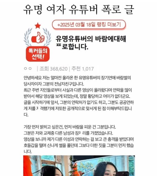 유머유명유튜버의 바람에 대해 폭ㄹ합니다.위키뉴스 기자입력북마크공유가글자크기프린트댓글 유명유튜버의 바람에 대해 폭ㄹ합니다.위키뉴스 기자[email protected]카카오톡페이스북트위터밴드URL복사