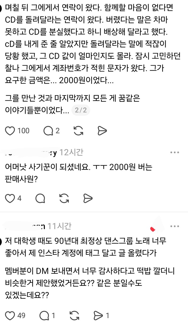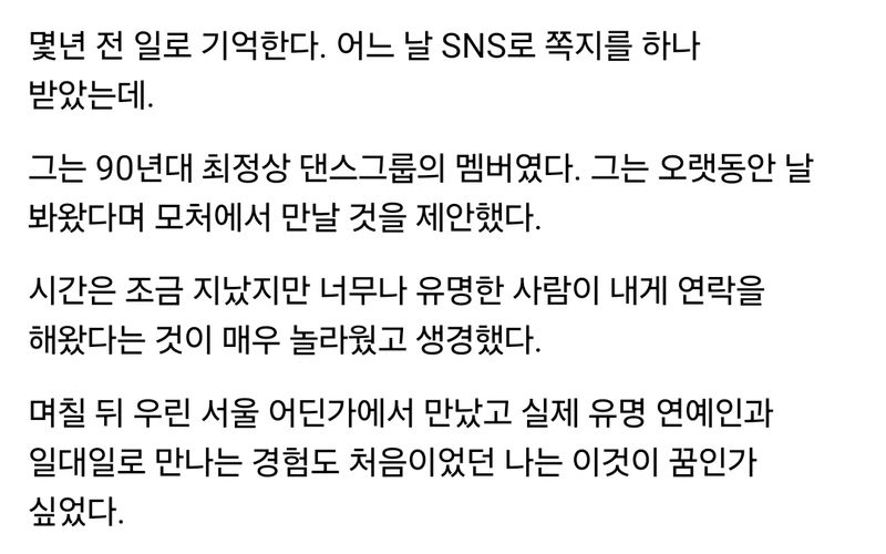유머90년대 최정상 댄스그룹 출신 가수가 SNS로 연락와서 만났는데...위키뉴스 기자입력북마크공유가글자크기프린트댓글90년대 최정상 댄스그룹 출신 가수가 sns로 연락와서 만났는데… 위키뉴스 기자[email protected]카카오톡페이스북트위터밴드URL복사