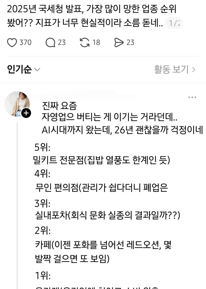 유머2025년 국세청 오피셜 가장 많이 망한 자영업위키뉴스 기자입력북마크공유가글자크기프린트댓글2025년 국세청 오피셜 가장 많이 망한 자영업 위키뉴스 기자[email protected]카카오톡페이스북트위터밴드URL복사