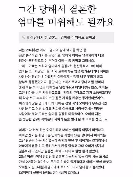 유머ㄱ간 당해서 결혼한 엄마를 미워해도 될까요위키뉴스 기자입력북마크공유가글자크기프린트댓글 ㄱ간 당해서 결혼한 엄마를 미워해도 될까요 ㅗㅜㅑ....위키뉴스 기자[email protected]카카오톡페이스북트위터밴드URL복사