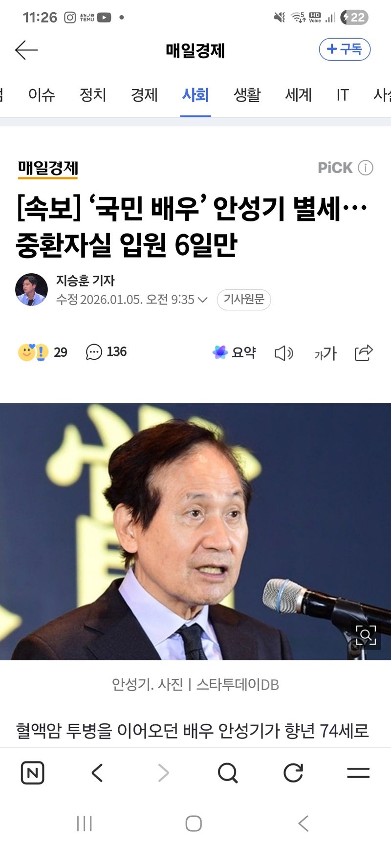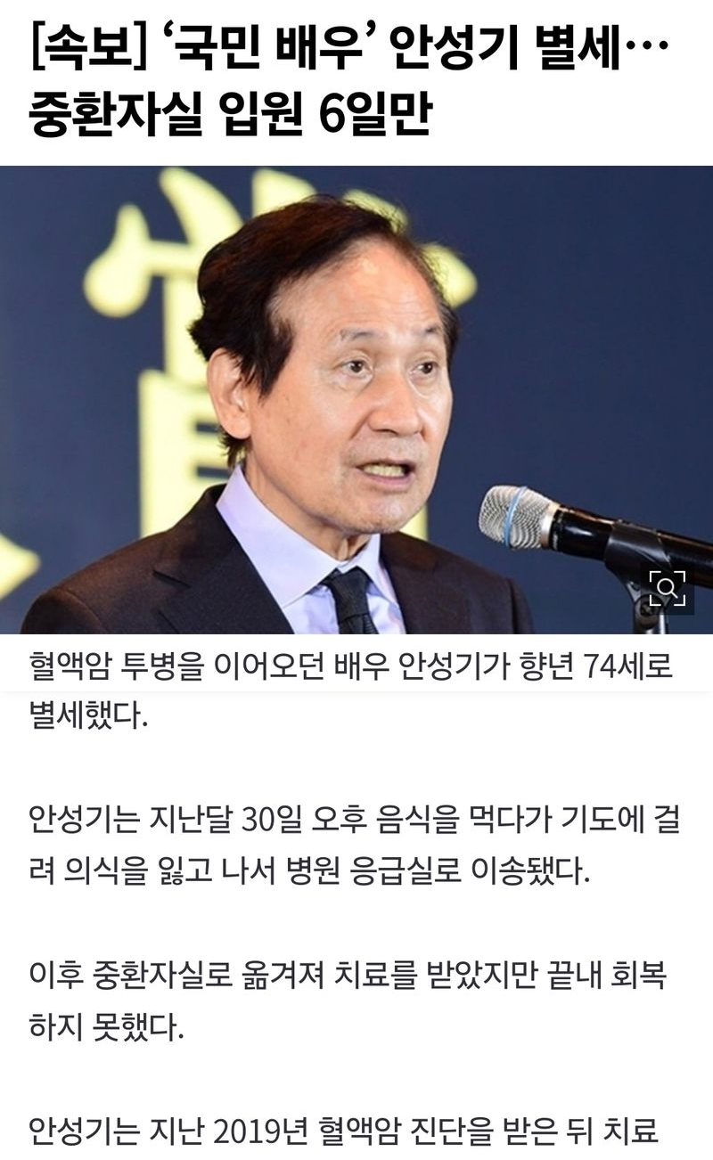 유머[속보] 배우 안성기, 향년 74세로 별세 고인의 명복을 빕니다위키뉴스 기자입력북마크공유가글자크기프린트댓글[속보] 배우 안성기, 향년 74세로 별세고인의 명복을 빕니다 위키뉴스 기자[email protected]카카오톡페이스북트위터밴드URL복사