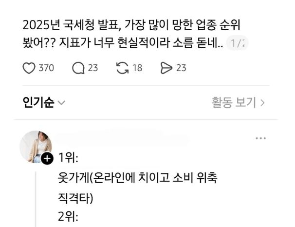 리와인드뉴스2025년 국세청 오피셜 가장 많이 망한 자영업 ㄷㄷㄷ위키뉴스 기자입력북마크공유가글자크기프린트댓글 2025년 국세청 오피셜 가장 많이 망한 자영업 ㄷㄷㄷ 먹고 살기 힘들다....본인이 천재가 아닌이상 웬만하면 회사에 있어라..위키뉴스 기자[email protected]카카오톡페이스북트위터밴드URL복사